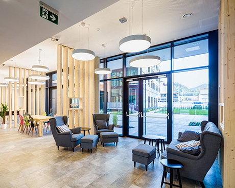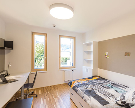 Majoritatea studentilor internationali ai universitatii stau cazati in OeAD Guesthouse mineroom, care opereaza din 2016 si este prima casa pasiva de mare volum din lume construita ca structura cu cadru din lemn. Sunt oferite, de asemenea, si alte optiuni de cazare, lista carora poate fi gasita in aceasta pagina.