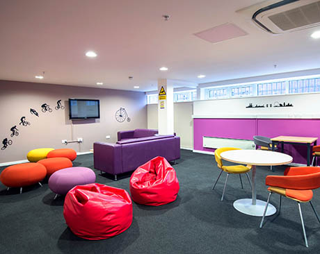 Cazare in campusul Bellerbys College, in camere single cu baie proprie; camerele sunt grupate in apartamente cu o bucatarie comuna.